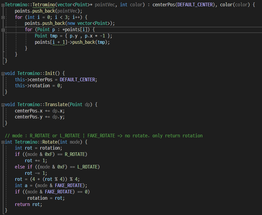 Tetromino 클래스는 각 미노의 좌표들을 가지고 있다. 각 미노의 중심 블록으로부터 상대적인 나머지 블록들의 대한 좌표를 담은 points 벡터를 계속 불러와 화면에 그려줄 수 있게 하였다.